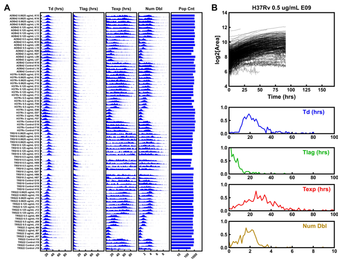Above is an example of the output from a ODELAM experiment depicting 80 spotted cultures across 5 conditions. The histogram plots depict key growth parameters, including doubling time, lag time, duration of exponential growh phase, the number of observed doublings, and the population size of each spot. This data allowed us to identify subpopulations of drug-resistant Mycobacterium tuberculosis (Mtb) in patient-isolated samples.