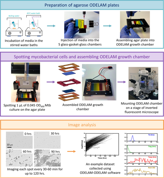 ODELAY consists of a mount for the agar slide, timelapse imaging inside a microscope incubator and software to extract colony area over time.